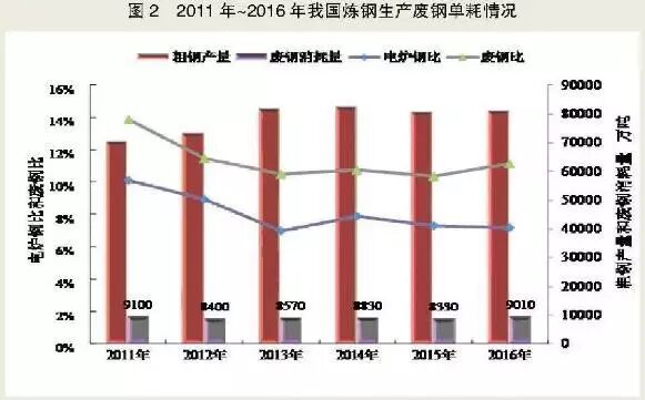 废钢消费情况。钢铁行业废钢消费情况与废钢资源供应情况类似,2011年废钢铁消耗量达到近年来峰值(9100万吨)之后,整体呈现波动下降趋势。炼钢废钢比在低位徘徊,与电炉钢比存在密切相关性。2011年~2016年我国电炉钢比总体呈下降趋势,2011年以来长期处于10%以下。我国炼钢废钢比变化趋势与电炉钢比呈正相关,2011年~2015年,废钢比逐年缓慢下降,从2011年的13.8%降至2015年的10.4%;2016年,废钢比小幅提高,达到11.1%。图2为2011年~2016年我国废钢消费情况。