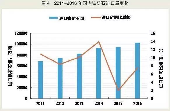 图4为2011年~2016年我国铁矿石进口量情况变化。可以看出,2011~2016年我国铁矿石进口量总体呈上升趋势。2011年,我国铁矿石进口量为6.9亿吨,同比增长10.9%;2014年,我国铁矿石进口量为9.33亿吨,同比增长13.9%;2016年,我国铁矿石进口量高达10.2亿吨。2011年~2016年铁矿石进口年均复合增长率为8.3%。由此可见,我国自成为世界最大的铁矿石进口国以来,在缺失铁矿石定价权的前提下,一直保持着非常高的对外铁矿石依存度。现阶段,若抓住机遇大力发展短流程电炉钢,可逐渐改变长流程炼钢对铁矿石依赖的格局,同时防止几年后出现国内既需要大量进口铁矿石,采用高能耗、高排放的“高炉-转炉”工艺生产钢铁,又要把大量具有高绿色生态价值的废钢资源出口海外的不合理现象。