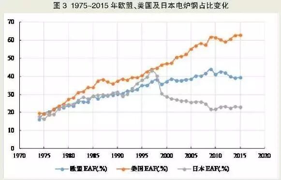 从全球钢铁生产流程结构发展趋势来看,发展电炉炼钢是必然趋势。目前,世界钢铁生产主要采用“高炉-转炉”长流程及电炉短流程两种方式。世界主要钢铁大国或地区的发展规律表明,随着主原料废钢资源供应充裕,发展短流程炼钢是必然趋势。欧盟以及美国、日本等主要钢铁大国经历二战后高速发展,并在钢铁工业经历长期发展积累、废钢供应充裕的粗钢产量峰值区中后期开始兴起短流程电炉炼钢。图3为欧盟、美国和日本炼钢流程历年结构变化趋势。2015年,美国电炉钢比例达到62.7%,欧洲电炉钢比例39.4%,日本电炉钢比例22.9%,而中国电炉钢比例仅7%左右,有非常大的发展空间。随着国内粗钢产量进入峰值弧顶下行区间,废钢资源供应充足,电炉炼钢将迎来发展机遇。
