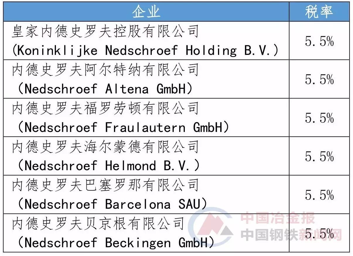 商务部发布《关于进口自荷兰皇家内德史罗夫控股有限公司的碳钢紧固件所适用的反倾销措施进行倾销及倾销幅度期中复审裁定的公告》(2017年第50号),做出复审裁定:经调查,调查机关裁定进口自荷兰皇家内德史罗夫控股有限公司及其关联公司的碳钢紧固件在复审调查期内存在倾销。对相关公司征收的反倾销税税率如下: